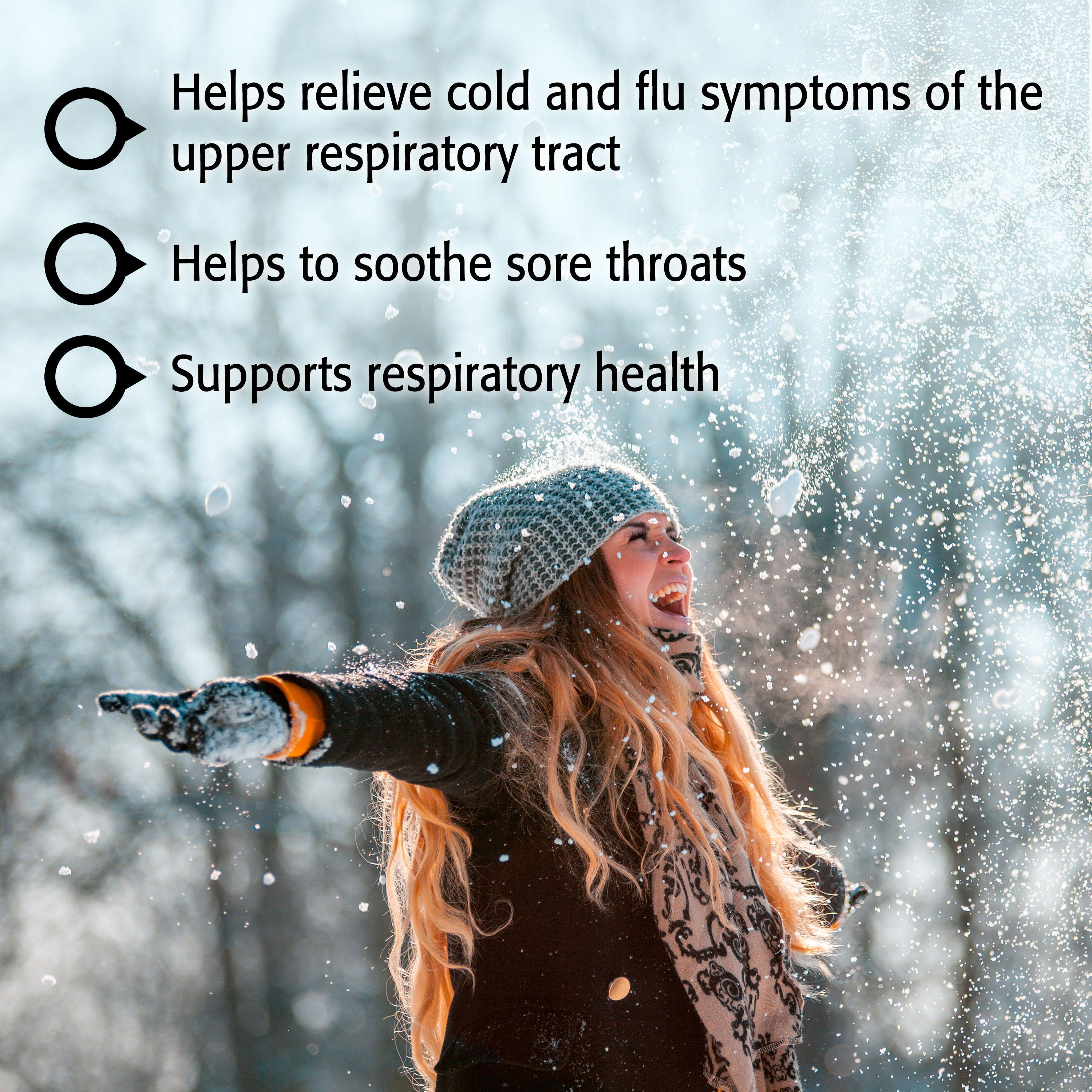 - Helps relieve cold and flu symptoms in the upper respiratory tract