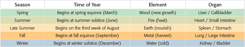 In Chinese medicine, each season and its element—wood, fire, earth, metal, or water—govern the flow of qi (energy) in the body. Proper flow of qi is key for health maintenance. Acupuncture and herbal treatments regulate the flow of qi to organs via energetic pathways (meridians) to heal the body and restore balance.