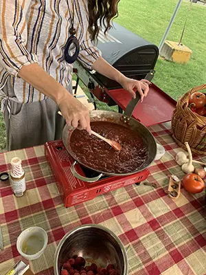 Add tomato sauce, birch syrup or brown sugar, apple cider vinegar, and liquid smoke; then, add in raspberries. Stir and bring to a boil.